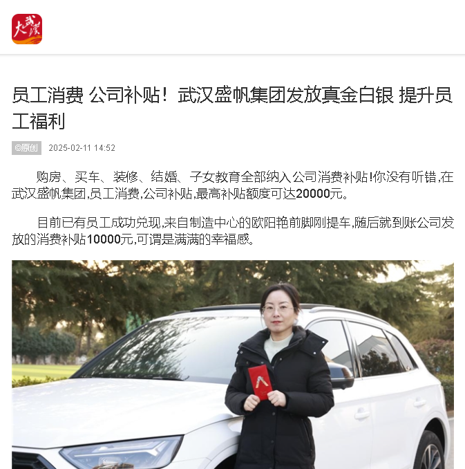 購房、買車、裝修、結(jié)婚、子女教育全部納入公司消費補貼,這是武漢盛帆集團推出的一項創(chuàng)新舉措,最高補貼額度可達20000元···